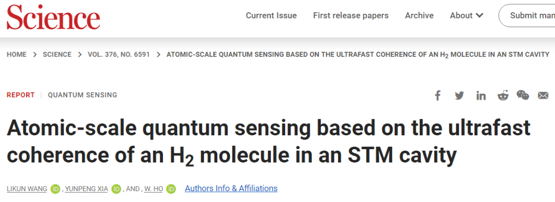 近日,DB电竞官方网站材料科学与工程学院无机非金属材料工程专业2012届校友王利坤作为第一作者在《Science》杂志发表了题为“Atomic-scale quantum sensing based on the ultrafast coherence of an H2 molecule in an STM cavity”(基于隧道结内氢气分子超快相干性的原子级量子传感)的研究文章,成功将氢原子变成量子传感器,使其具有前所未有的时间和空间分辨率。