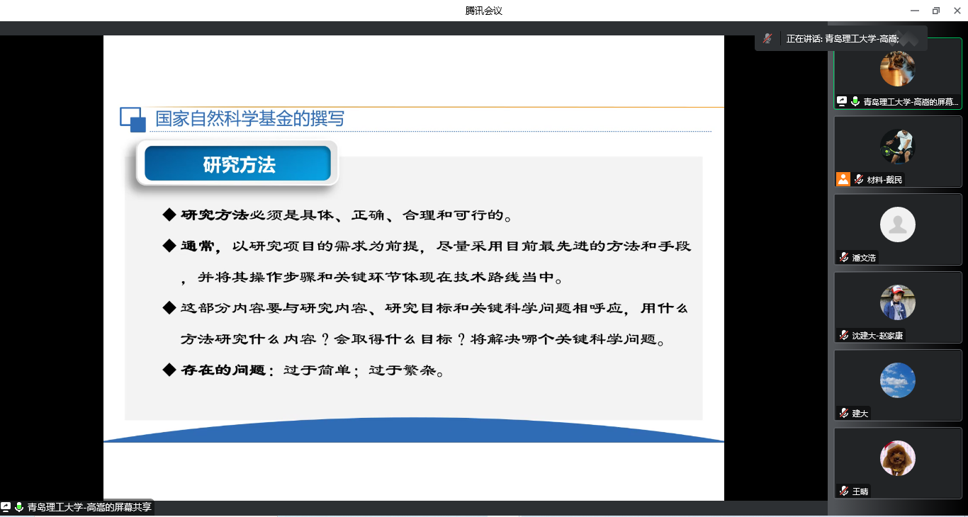 为进一步做好2023年国家自然基金申报工作,增强教师申报的能力和信心,提升申报书写作质量,近日,材料科学与工程学院在线上召开了2023年国家自然科学基金项目申报交流会,邀请青岛理工大学高嵩教授进行了国家自然科学基金项目申报经验的分享,学院具备基金申报资格的老师参加了会议,会议由副院长戴民主持。